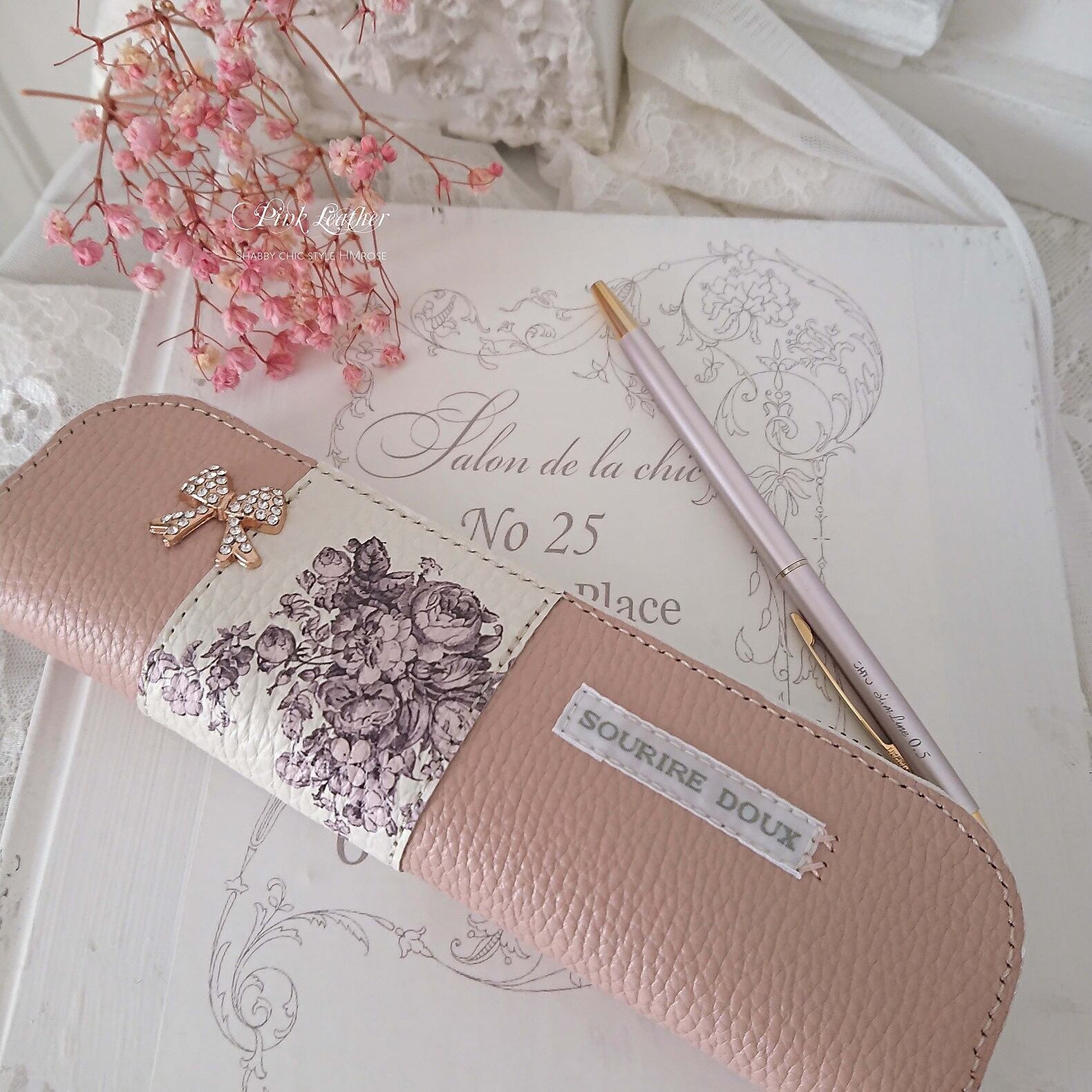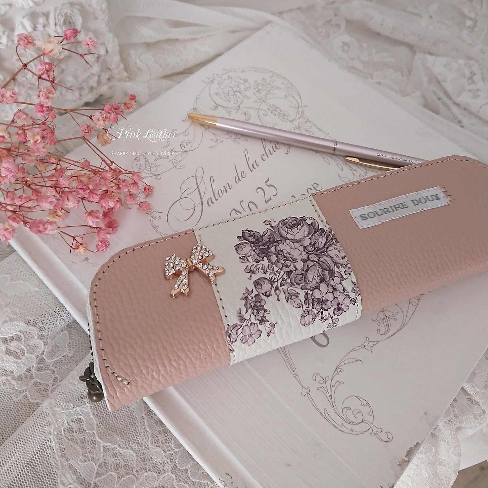 春色の優しいベビーピンク革に、上品なrose柄をコーディネートした